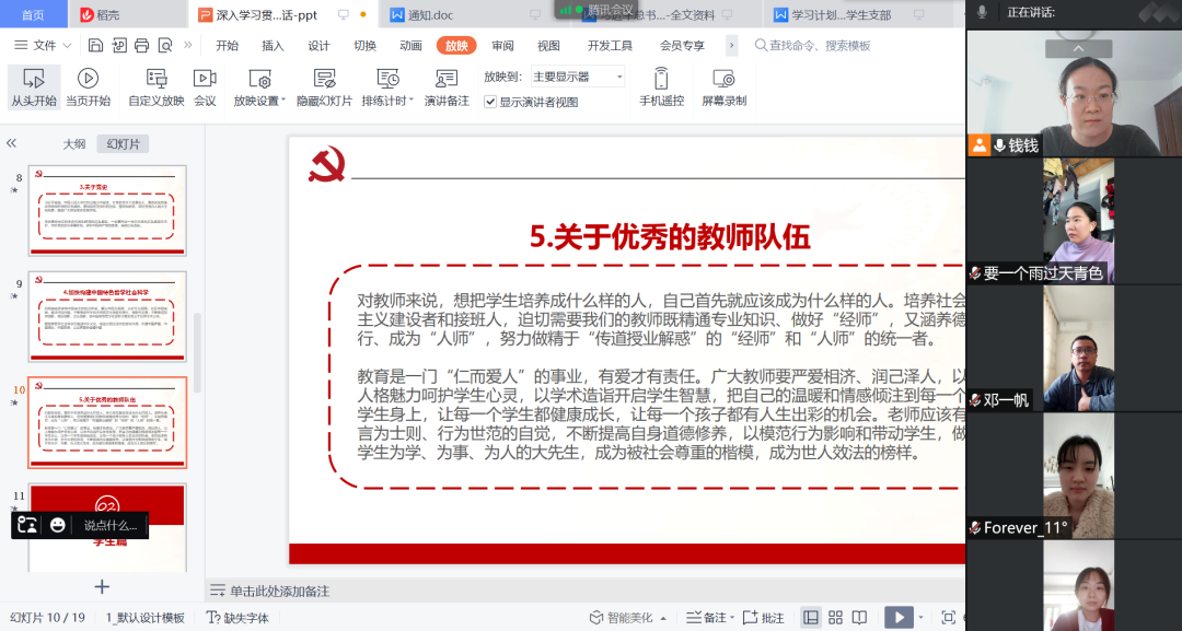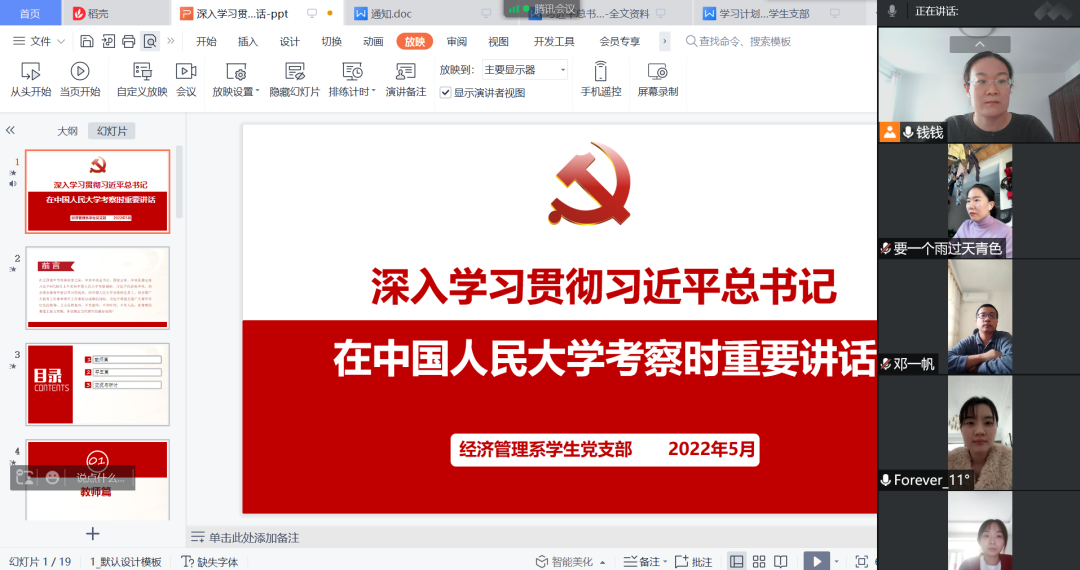 在集中学习中,我系学生党支部书记钱伟老师传达了教育部党组《关于教育系统深入学习贯彻习近平总书记在中国人民大学考察时重要讲话精神的通知》,从讲话精神中,老师们围绕“坚持党的领导传承红色基因扎根中国大地,走出一条建设中国特色世界一流大学新路”的主题和中心思想分别谈了自己的职业理想和目标,再次深化“立德树人”使命,秉承为党育人,为国育才的决心砥砺前行。