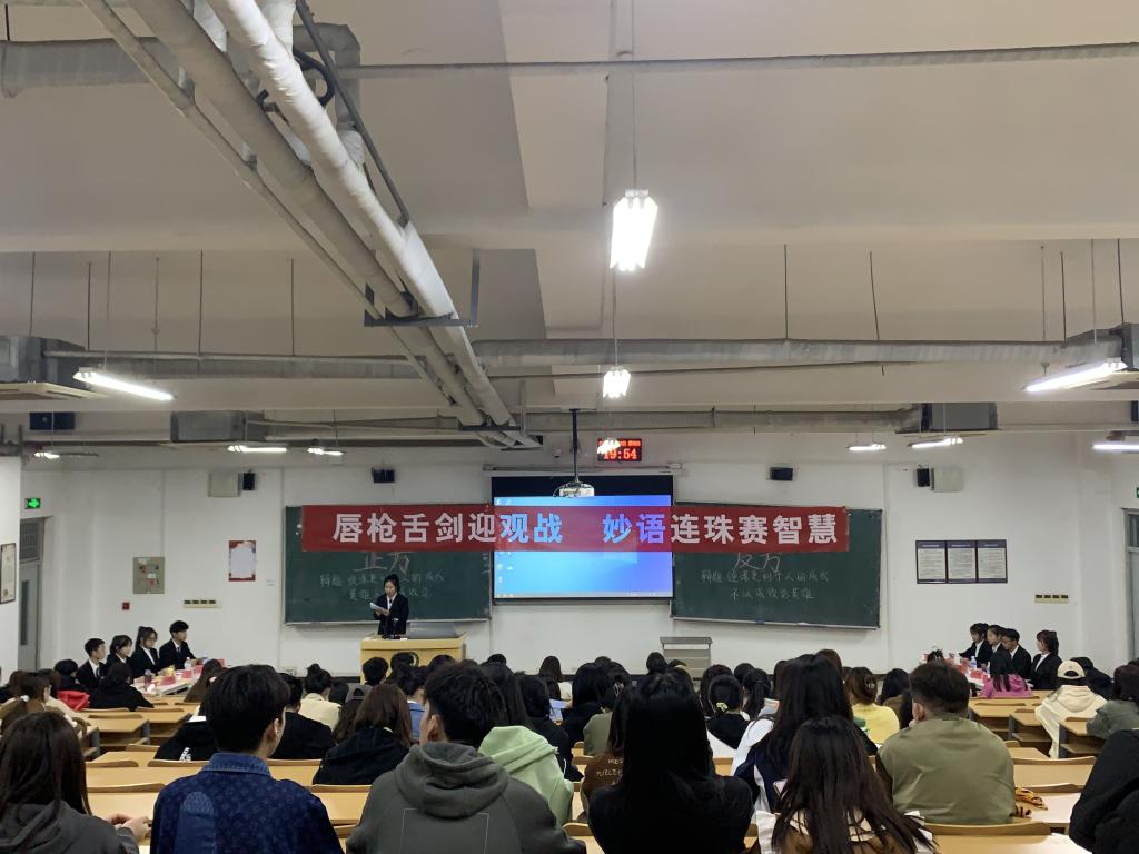 为丰富同学们的课余生活,活跃校园气氛,培养大家的思辨能力和语言表达能力。我系于3月19日晚上七点半在C1-1教室举办“唇枪舌战迎观战,妙语连珠赛智慧”辩论比赛。本次辩论赛由我系学习部组织开展,参加本次辩论赛的有22级同学以及辩论队全体成员。