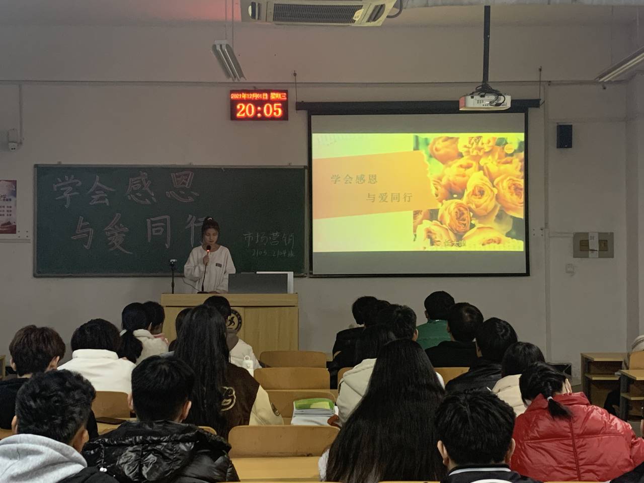 为了让同学们懂得感恩是一种生活态度,是一种美德,是做人的起码修养和道德准则。我系于12月1日晚七点半在C区203教室举办“学会感恩与爱同行”主题班会。参加本次班会的有市场营销3班、4班全体同学。