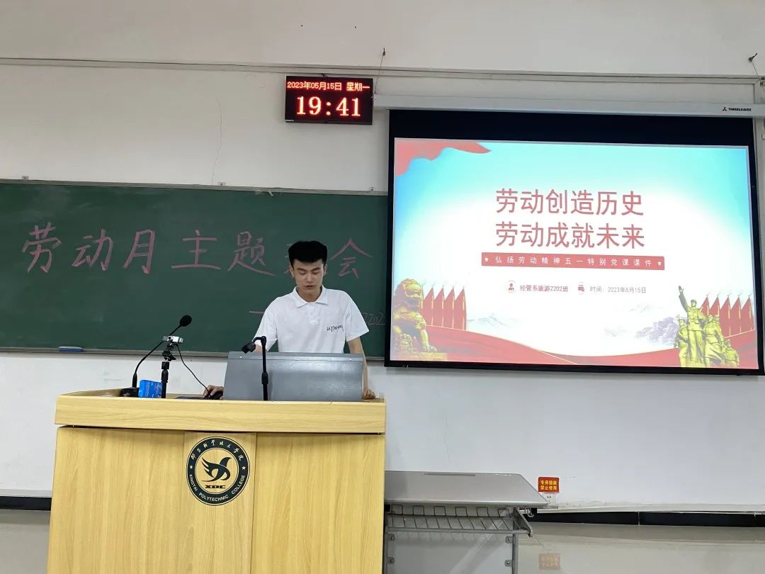 为弘扬劳动精神,提高学生劳动素养,帮助学生树立劳动最光荣、劳动最崇高、劳动最伟大、劳动最美丽的正确观念,体验到劳动的快乐,增强社会责任感。我系于2023年5月15日晚上7:30,在C区203教室开展“劳动教育”主题班会。本次活动由22级旅游专业举办。参加的成员有22级旅游专业同学。