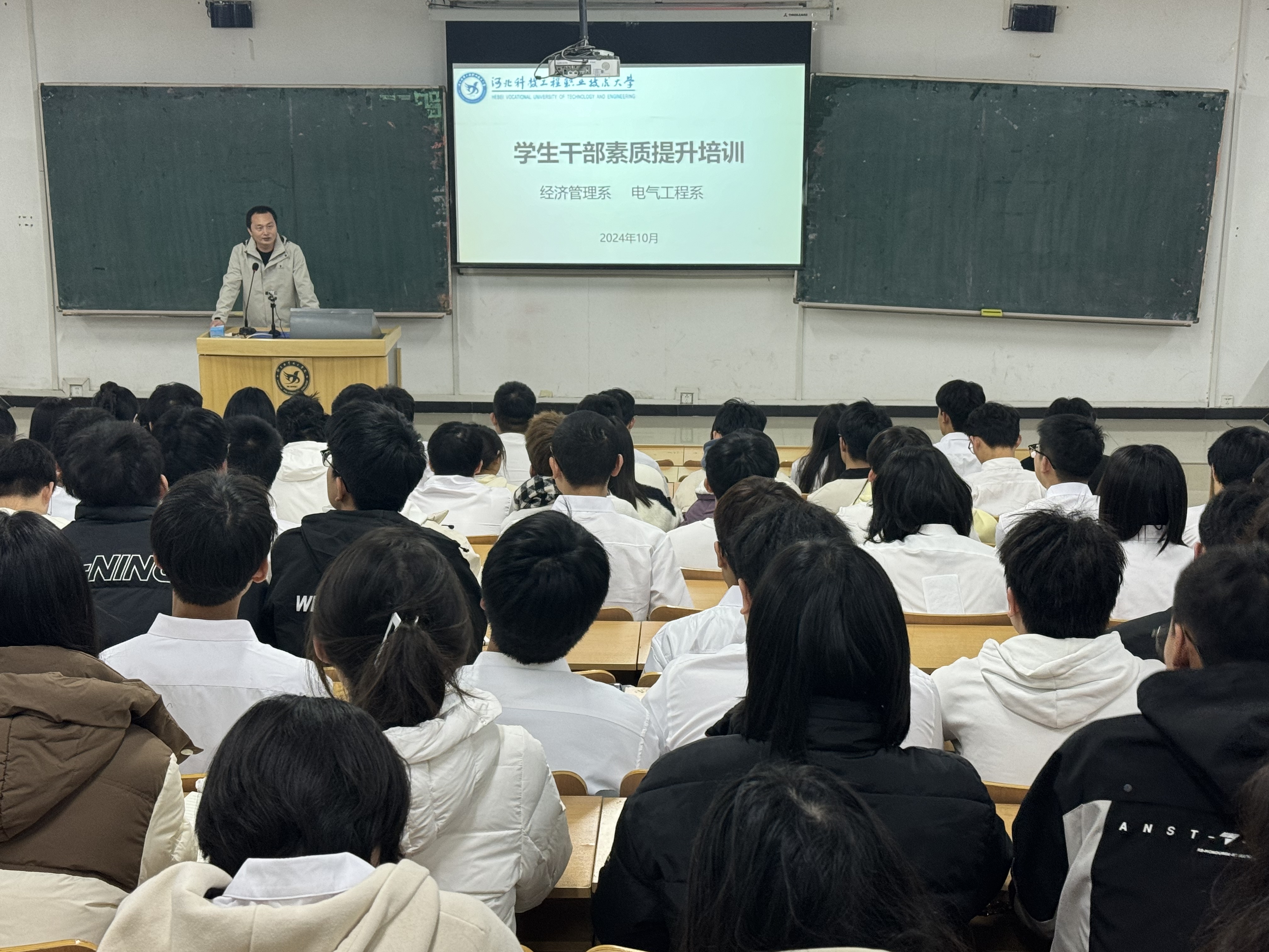 为加强学生干部队伍建设,提升学生干部的思想认识与工作能力,11 月 6 日,经济管理系与电气工程系在 C1 - 1 教室联合开展学生干部培训大会。本次大会由经济管理系副书记柴民杰和电气工程系副书记黄涛主讲,两系全体学生干部参会。