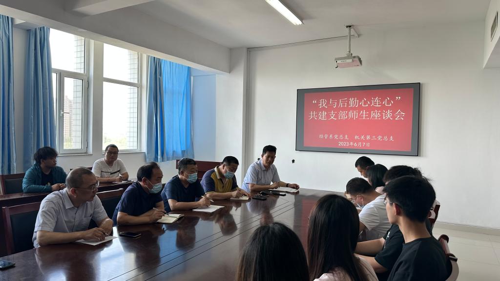 为深入贯彻党的二十大精神,落实学院党支部结对共建活动,充分发挥基层党建的核心引领作用,构建帮扶互助、相互促进、共同提高的基层党建格局。6月7日下午3:00,我系党总支与机关第三党总支第一支部开展“我与后勤心连心”党建共建主题活动。系党总支副书记徐平(主持工作)、后勤管理处处长李磊、公寓服务中心主任王星一、饮食服务中心主任黄英强等相关中心负责人及部分师生代表参加座谈。