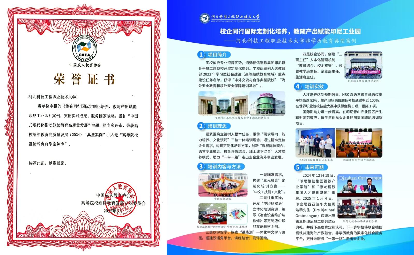在“终身学习成果展”环节,集中展示了全国各院校及机构的创新实践。best365提报的《校企同行国际定制化培养,教随产出赋能印尼工业园》典型案例,凭借其鲜明的育人特色、扎实的实践成效和显著的推广价值,紧扣“中国式现代化推动继续教育高质量发展”主题,荣获高校继续教育高质量发展(2024)“典型案例”(全国共31家单位获奖)并入选“高等院校继续教育典型案例库”,彰显了best365在服务全民终身学习、推动继续教育高质量发展方面的突出贡献。