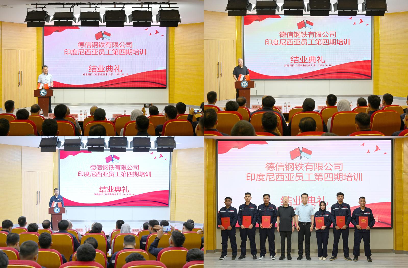 结业典礼在回顾学员学习生活的宣传片中拉开序幕。马东霄向圆满完成学业的印尼学员表示祝贺。他指出,此前“印尼德信集团钢铁产业学院”与“德龙钢铁集团人才培训基地”的揭牌,标志着校企合作迈入新阶段。前三期132名学员已在生产一线应用所学,其中40人获得晋升。学校将继续以服务企业海外人才需求为导向,完善海外员工培训体系,培养更多“通语言、懂技术、跨文化”的复合型人才,赋能“一带一路”建设。