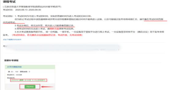 5. 查看课程考试须知,点击绿色“开始考试按钮”(该部分有腾讯会议字眼,忽略即可)