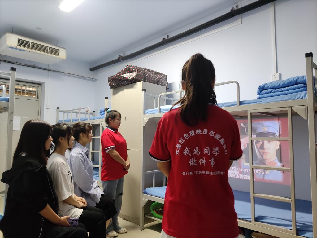 为扎实推进党史学习教育,学习百年党史,汲取奋斗力量,不断推动党史学习教育成果转化为服务青年的生动实践。5月18日,我系学生会党员志愿服务队走进学生宿舍开展“我是红色放映员”志愿服务活动,会计系部分学生干部代表参加了此次活动。