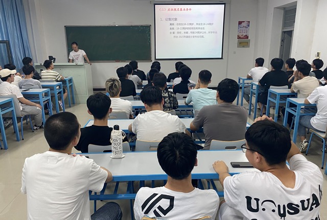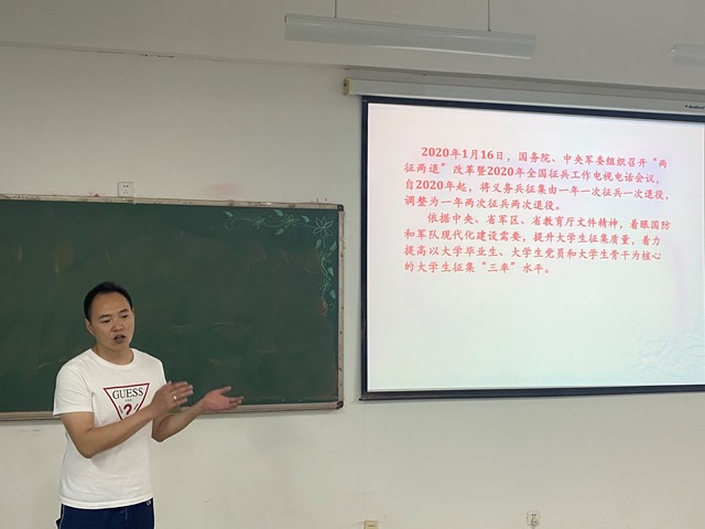 会议伊始,冯渊老师首先向同学们讲述了征兵工作的意义及相关优惠政策,号召同学们依法履行兵役义务,投身国防建设。随后又向学生们介绍了2021年征兵工作的预征对象、身体条件等情况。接着又对之前学生提出的有关学费减免、落户要求、复学助学等相关问题作出了回答。会议最后,冯渊老师总结到:“党和国家为我们创造了今天的幸福生活,我们更应当用自己的力量为祖国明天的发展和安全作出努力,积极参军,保家卫国。”