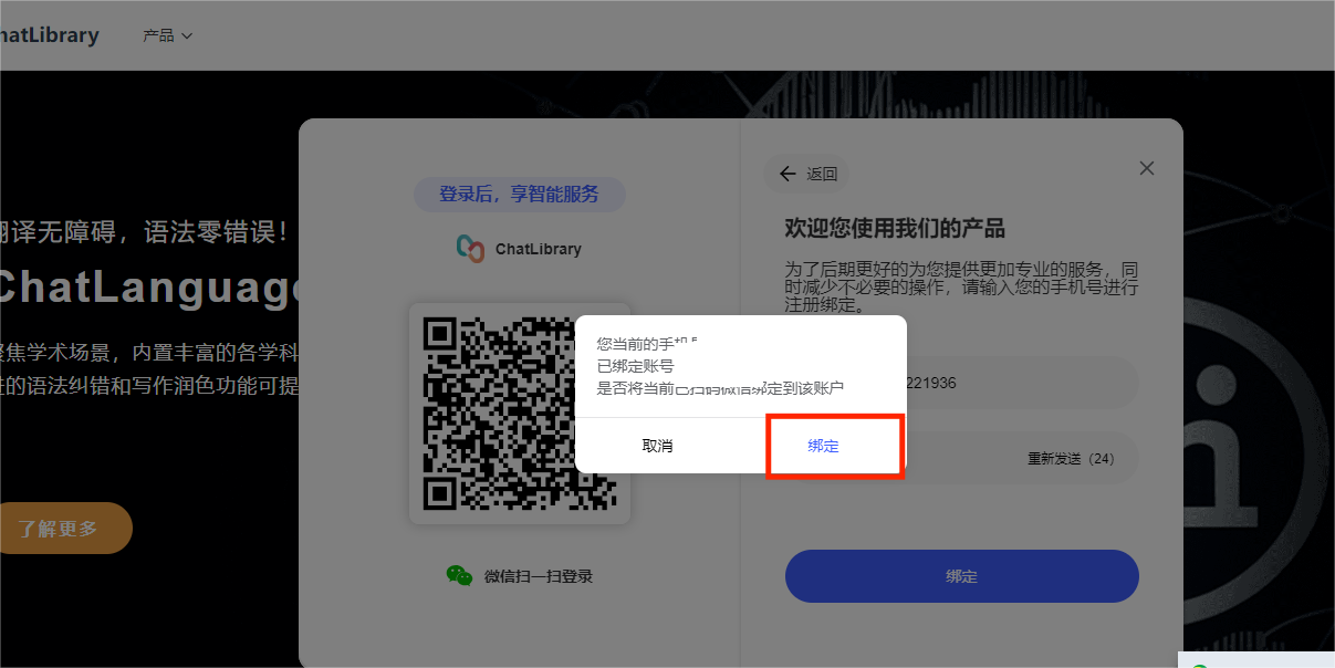 首次登录ChatLibrary AI智能服务平台,需进行微信绑定、手机号绑定,具体流程如下: