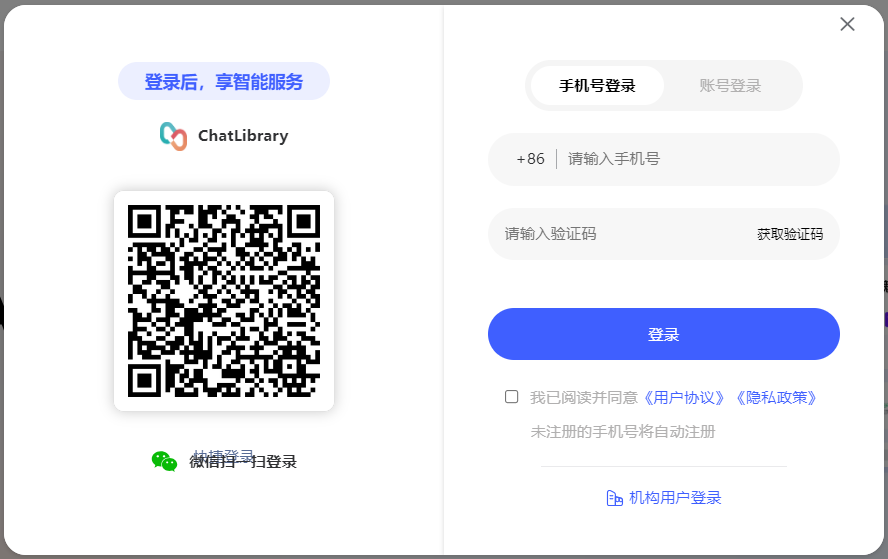 (1)打开ChatLibrary AI智能服务平台,点击右上角的“登录/注册”按钮,弹出登录框。