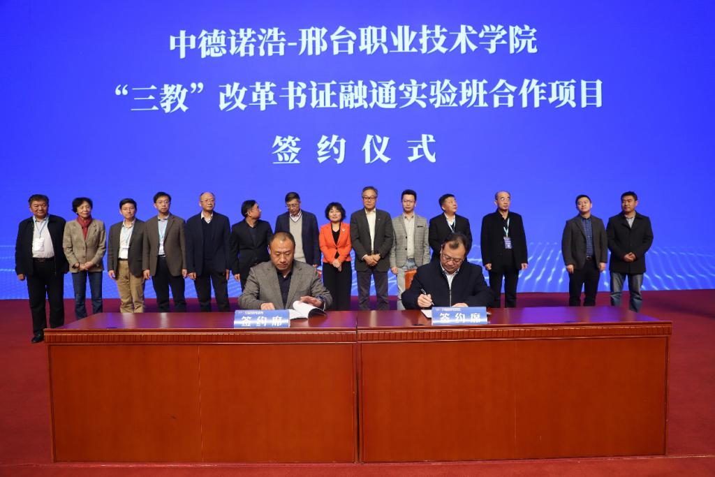 11月13日—14日,2020年第五届中国新能源及智能网联汽车职业教育产教融合论坛在北京会议举办。院领导赵建光、汽车工程系书记马金刚、教师张华参加了此次论坛。会上,院领导赵建光教授代表学院签订了“中德诺浩—邢台职业技术学院‘三教’改革书证融通实验班”合作项目,马金刚教授就学院情况和“1+X”证书制度工作进行了交流。