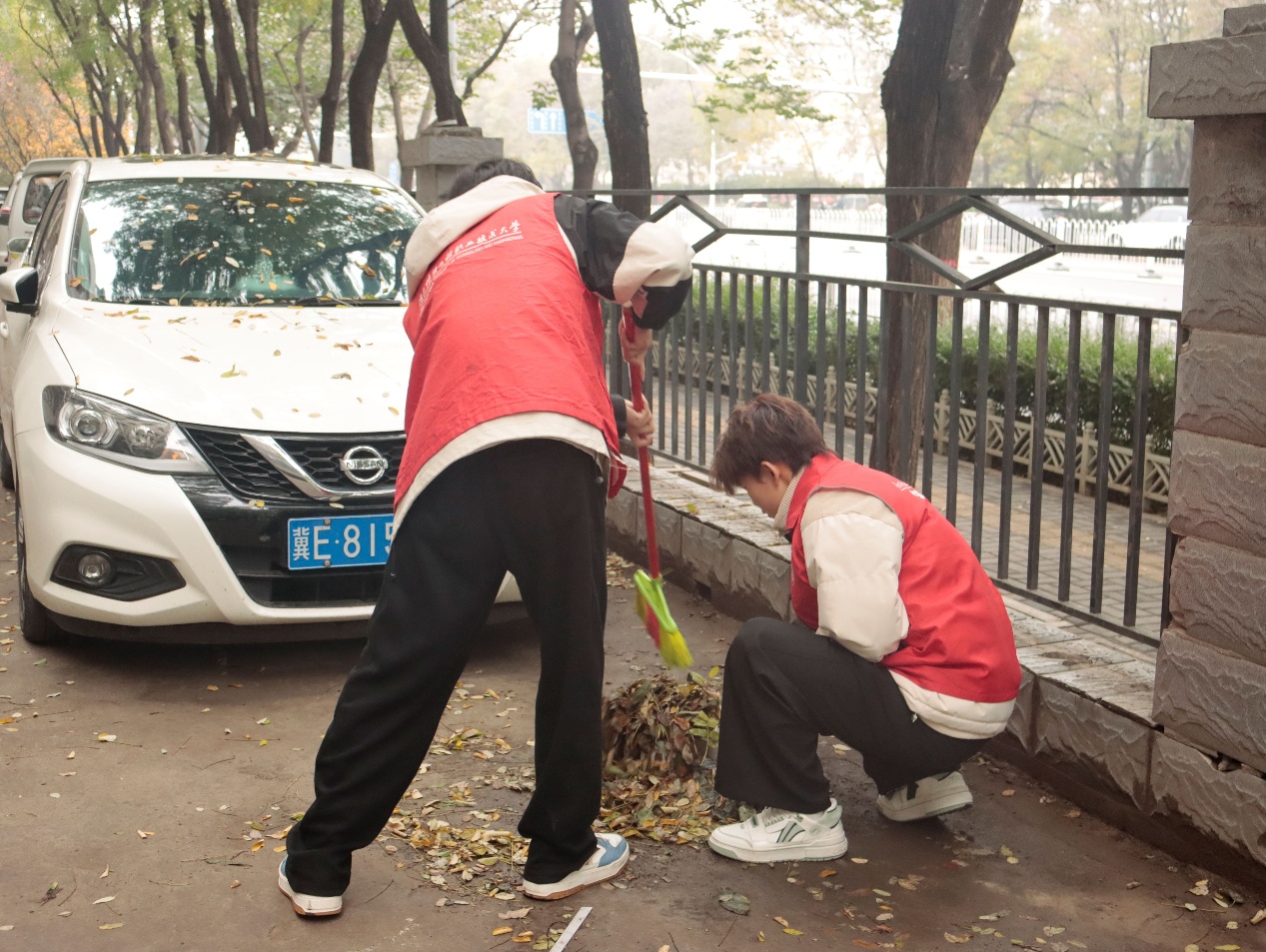 前夜的微雨让地面泛着湿润的光泽,落叶紧贴路面,为清扫工作增添了几分难度。志愿者们手持工具,细心将落叶一片片归拢,又将散落的杂物逐一拾起。彼此之间默契配合,动作细致而有序,原本略显凌乱的路面,渐渐恢复了整洁的模样。