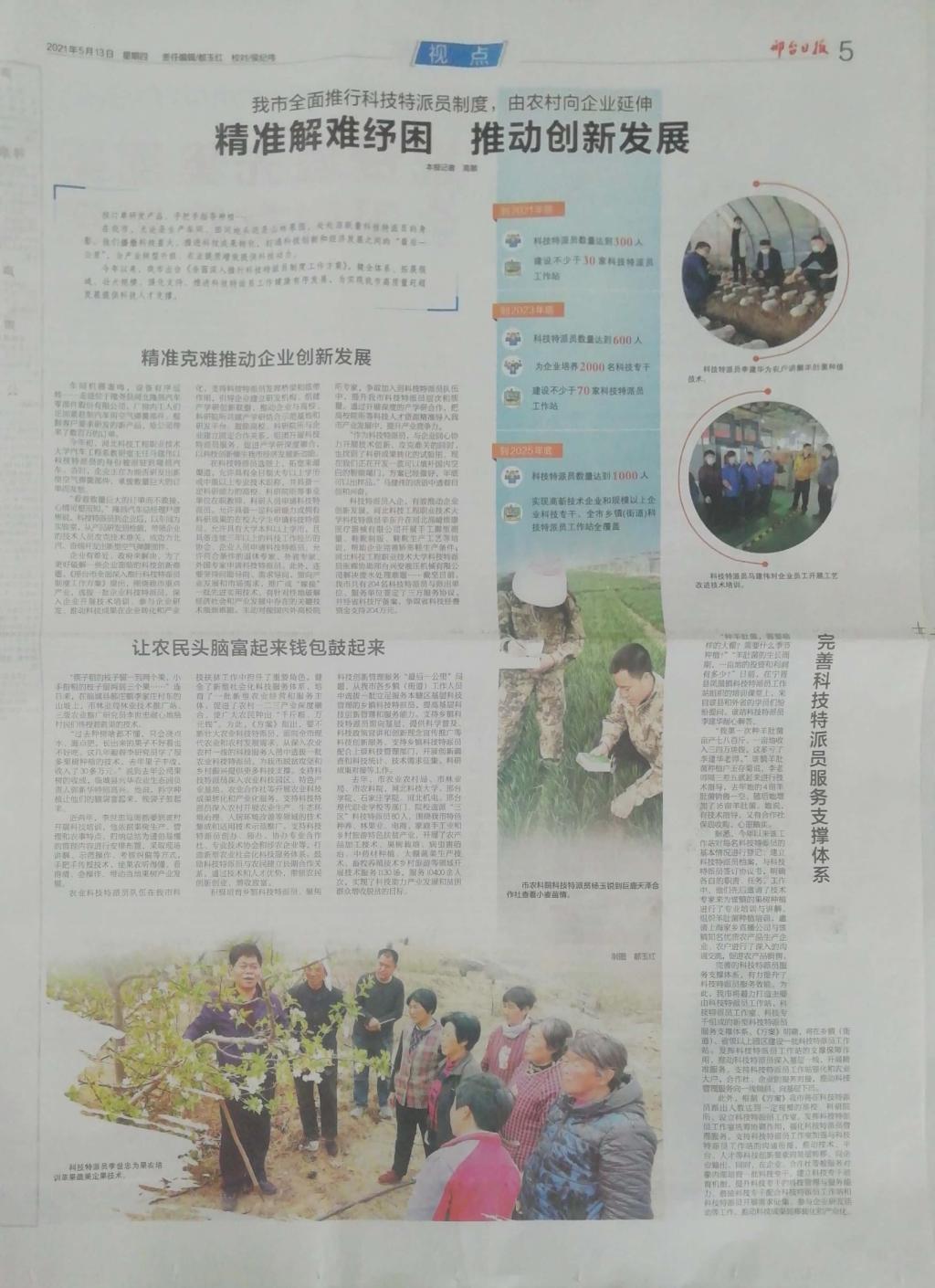 5月13日,《邢台日报》5版视点新闻以《完善科技特派员服务支撑体系》为题,报道了我系科技特派员马建伟老师积极投身自己的服务联系点开展技术服务培训的故事。