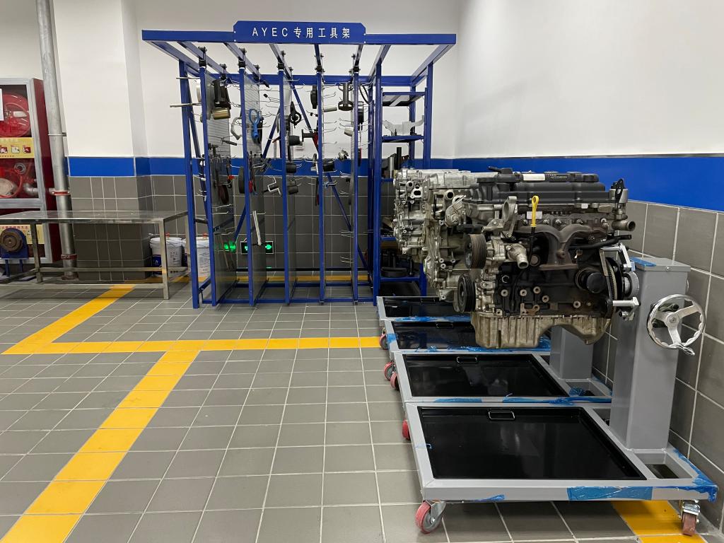 ASEP实训中心目前拥有理论教室、拆装教室、资料室、储藏室、多功能教室和实训场地。拆装教室配备多个翻转台架共8个工位,多功能教室多媒体教学设备配备齐全,实训场地配备包括四轮定位仪在内的七个举升工位和六辆实训车辆。教学和实训场地规范完善,为学生提供最优质的教学环境。