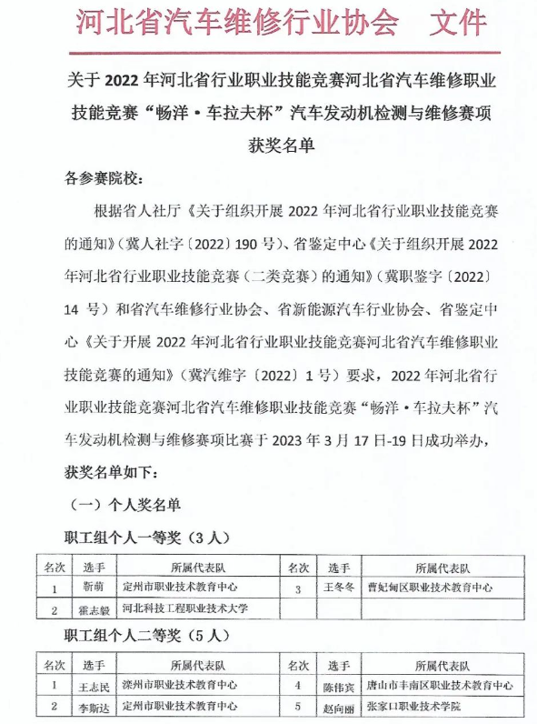 由河北省汽车维修行业协会和河北省职业技能鉴定中心主办的2022年河北省行业职业技能竞赛——河北省汽车维修职业技能竞赛“畅洋•车拉夫杯”汽车发动机检测与维修赛项于2023年3月17日至19日,在定州市职教中心成功举办。本次比赛原定于2022年11月举办,后因疫情推迟。该赛事分为职工组和学生组,来自省内23所中高职院校的98名师生同场竞技,旨在“以赛促教”,赋能学生“技能成才”。