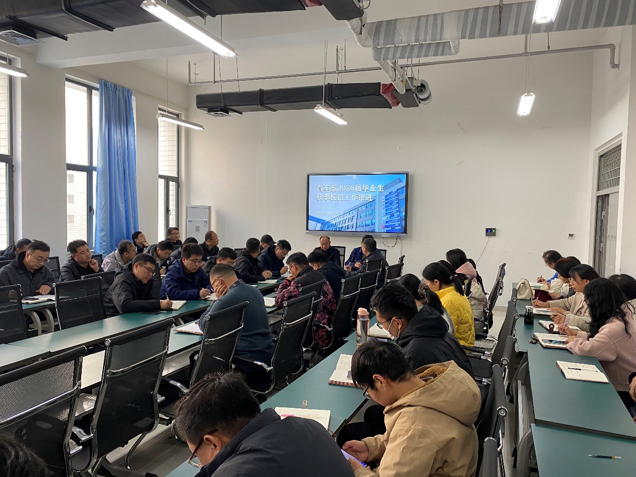 为抢抓秋招关键窗口期,精准对接汽车行业转型升级对人才的需求,迎接即将到来的秋季双选会,10月22日,汽车系在304会议室召开2026届毕业生秋季校招工作推进会。系领导班子和全体教师参加会议,会议由系党总支书记马金刚主持。