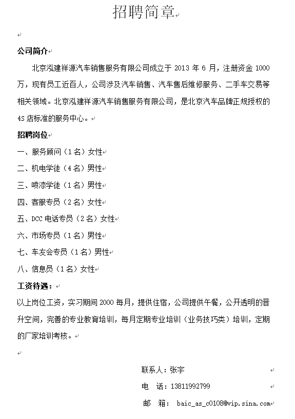 北京泓建祥源汽车销售服务有限公司招聘顾问、机电学徒等