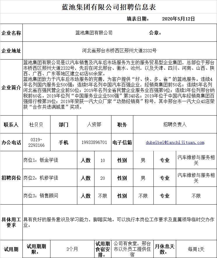 蓝池集团有限公司招聘钣金学徒、机修学徒、销售顾问