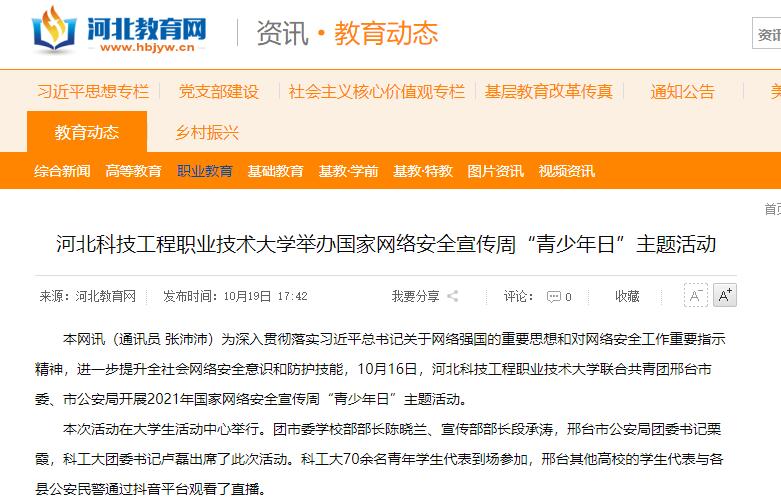 本网讯(通讯员 张沛沛)为深入贯彻落实习近平总书记关于网络强国的重要思想和对网络安全工作重要指示精神,进一步提升全社会网络安全意识和防护技能,10月16日,best365中国官方网站联合共青团邢台市委、市公安局开展2021年国家网络安全宣传周“青少年日”主题活动。