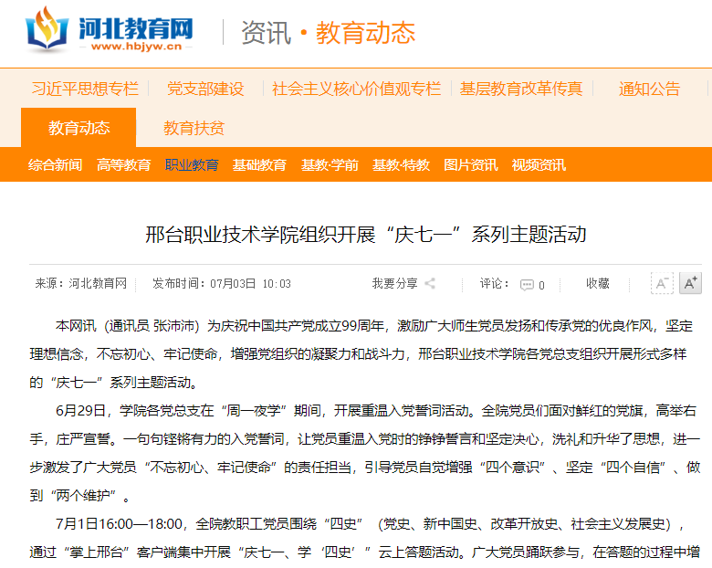 本网讯(通讯员 张沛沛)为庆祝中国共产党成立99周年,激励广大师生党员发扬和传承党的优良作风,坚定理想信念,不忘初心、牢记使命,增强党组织的凝聚力和战斗力,邢台职业技术学院各党总支组织开展形式多样的“庆七一”系列主题活动。
