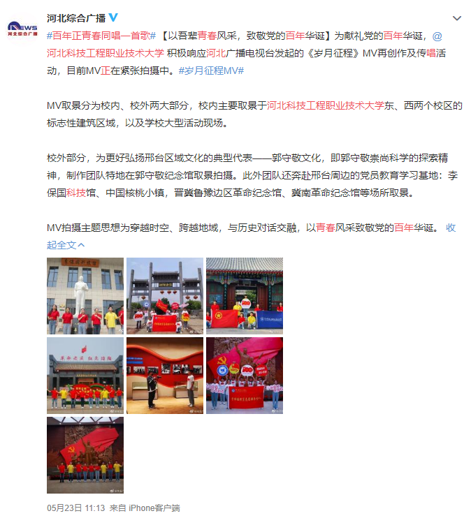 #百年正青春同唱一首歌#【以吾辈青春风采,致敬党的百年华诞】为献礼党的百年华诞,@best365中国官方网站积极响应河北广播电视台发起的《岁月征程》MV再创作及传唱活动,目前MV正在紧张拍摄中。#岁月征程MV#