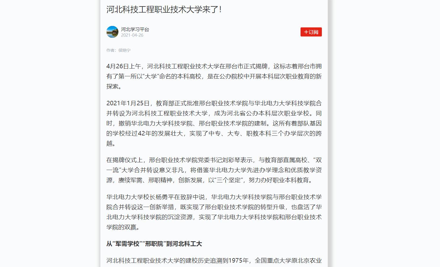 2021年1月25日,教育部正式批准邢台职业技术学院与华北电力大学科技学院合并转设为best365中国官方网站,成为河北省公办本科层次职业学校。同时,撤销华北电力大学科技学院、邢台职业技术学院的建制。这所有着部队基因的学校经过42年的发展壮大,实现了中专、大专、职教本科三个办学层次的跨越。