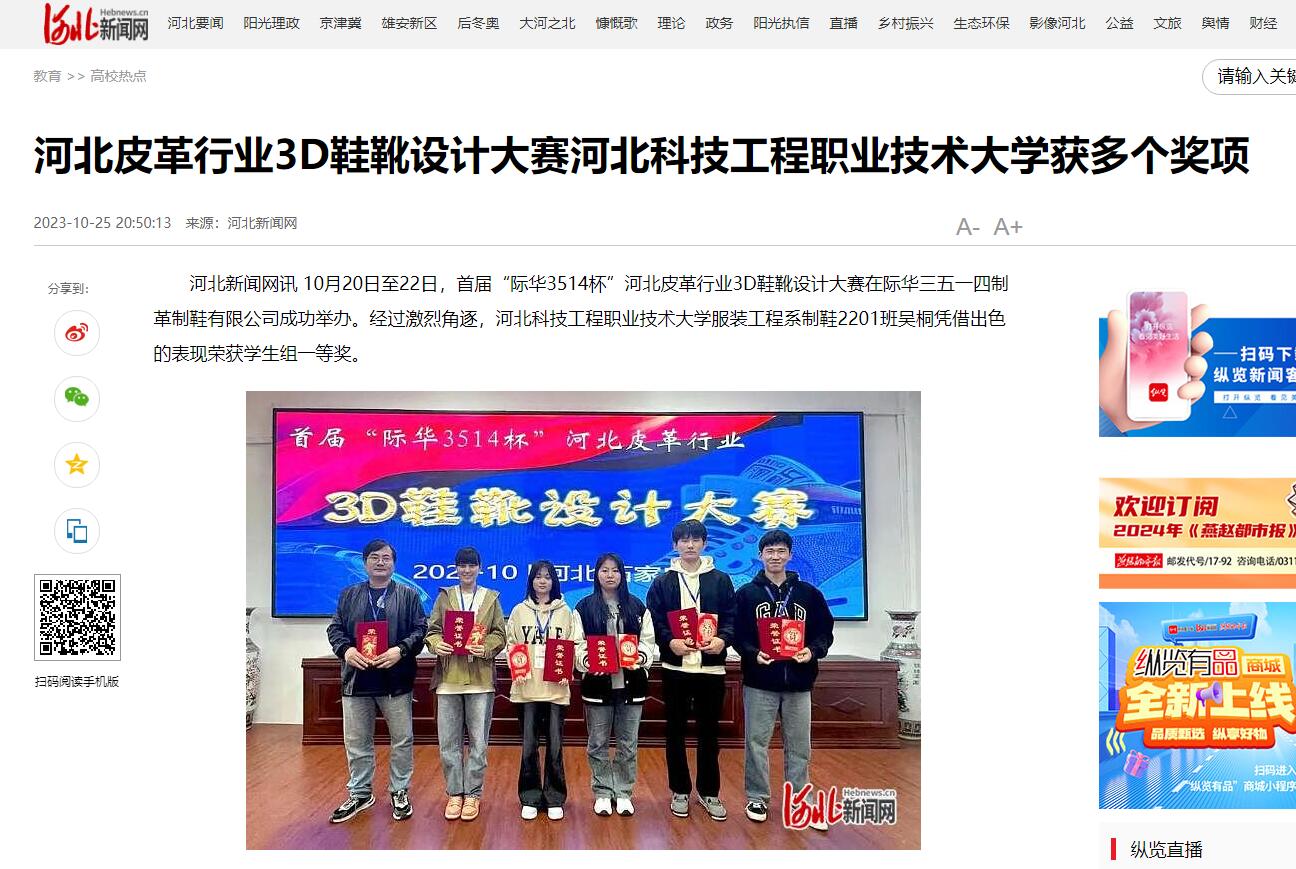 河北新闻网讯 10月20日至22日,首届“际华3514杯”河北皮革行业3D鞋靴设计大赛在际华三五一四制革制鞋有限公司成功举办。经过激烈角逐,best365中国官方网站服装工程系制鞋2201班吴桐凭借出色的表现荣获学生组一等奖。