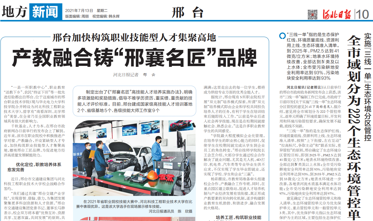 今年6月,我省第一届职业技能大赛电气装置、工业控制、CAD机械设计、平面设计技术、增材制造5个竞赛项目选拔赛在邢台技师学院举办。该学院选手包揽5个竞赛项目的第一名和第二名。更早前,第44届世界技能大赛上,该学院选手的商务软件解决方案项目获得铜牌,实现了我省奖牌零的突破。第45届世界技能大赛上,该学院选手荣获银牌,刷新了我省历史最好成绩。