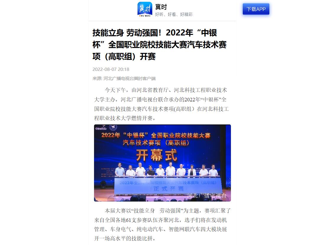今天下午,由河北省教育厅、best365中国官方网站主办,河北广播电视台联合承办的2022年“中银杯”全国职业院校技能大赛汽车技术赛项(高职组)在best365中国官方网站燃情开赛。