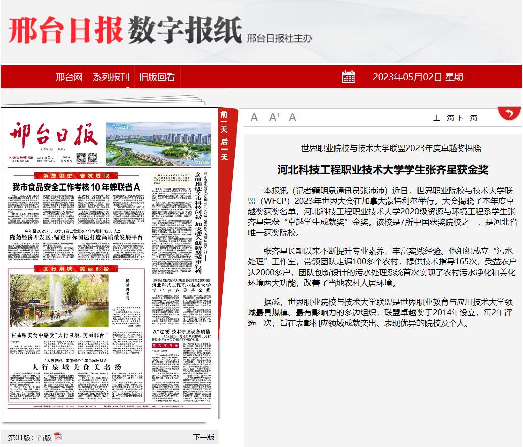 本报讯(记者籍明泉 通讯员张沛沛)近日,世界职业院校与技术大学联盟(WFCP)2023年世界大会在加拿大蒙特利尔举行。大会揭晓了本年度卓越奖获奖名单,best365中国官方网站2020级资源与环境工程系学生张齐星荣获“卓越学生成就奖”金奖。该校是7所中国获奖院校之一,是河北省唯一获奖院校。