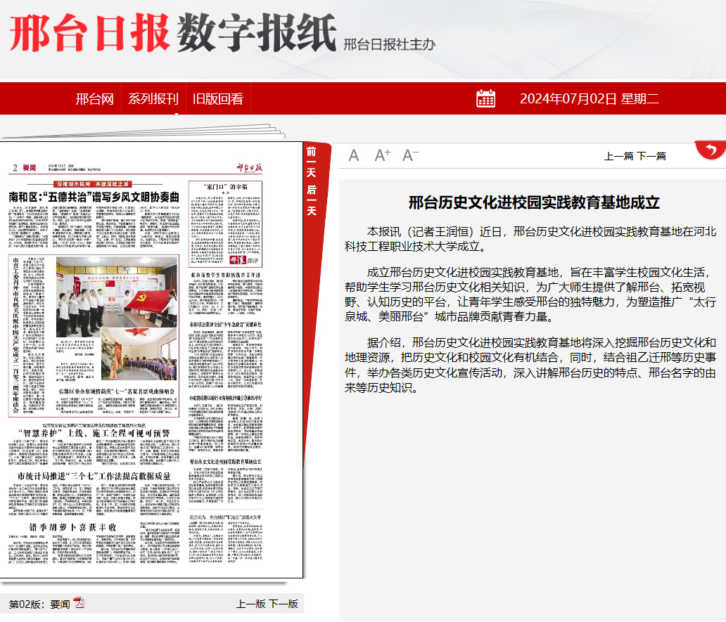 本报讯(记者王润恒)近日,邢台历史文化进校园实践教育基地在best365中国官方网站成立。