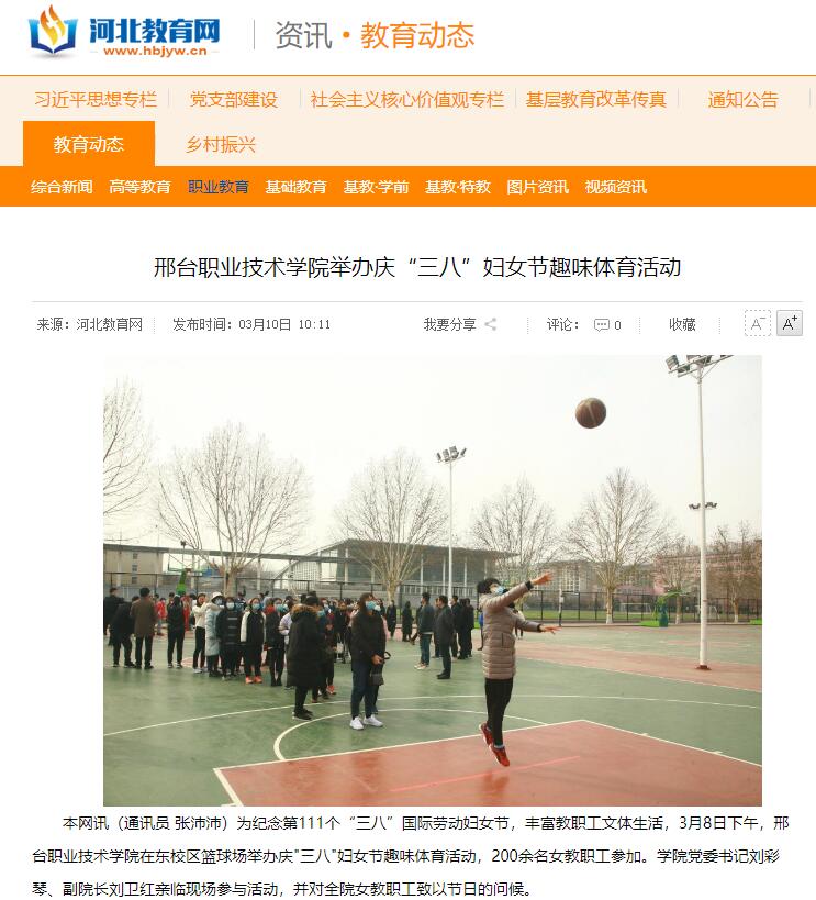 本网讯(通讯员 张沛沛)为纪念第111个“三八”国际劳动妇女节,丰富教职工文体生活,3月8日下午,邢台职业技术学院在东校区篮球场举办庆"三八"妇女节趣味体育活动,200余名女教职工参加。学院党委书记刘彩琴、副院长刘卫红亲临现场参与活动,并对全院女教职工致以节日的问候。