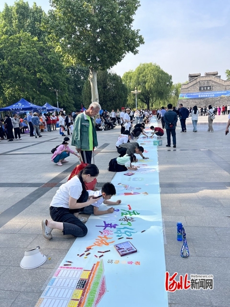 5月9日,在全国共青团为老志愿服务和助残志愿服务现场会上,孩子和家长认真为百米画卷涂色。 河北日报记者王永晨摄