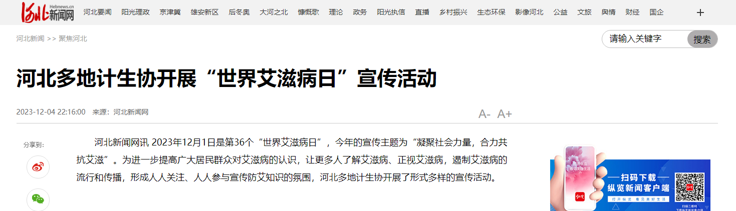 河北新闻网讯 2023年12月1日是第36个“世界艾滋病日”,今年的宣传主题为“凝聚社会力量,合力共抗艾滋”。为进一步提高广大居民群众对艾滋病的认识,让更多人了解艾滋病、正视艾滋病,遏制艾滋病的流行和传播,形成人人关注、人人参与宣传防艾知识的氛围,河北多地计生协开展了形式多样的宣传活动。