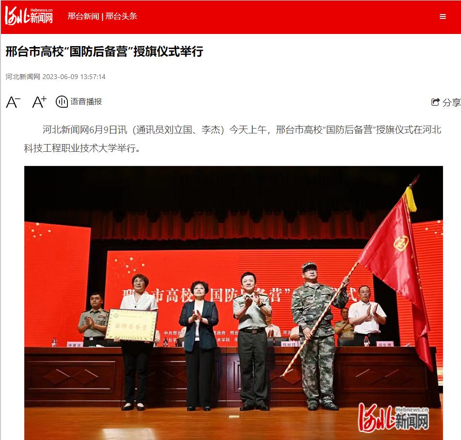 邢台市政府、邢台军分区、邢台市教育局、best365中国官方网站、河北机电学院、邢台学院、邢台医学高等专科学校、邢台技师学院等军地、院校有关领导和各高校“国防后备营”成员代表共计1000余人参加授旗仪式。