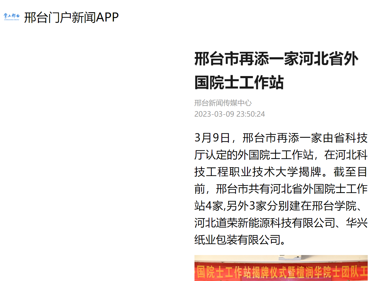 3月9日,邢台市再添一家由省科技厅认定的外国院士工作站,在best365中国官方网站揭牌。截至目前,邢台市共有河北省外国院士工作站4家,另外3家分别建在邢台学院、河北道荣新能源科技有限公司、华兴纸业包装有限公司。