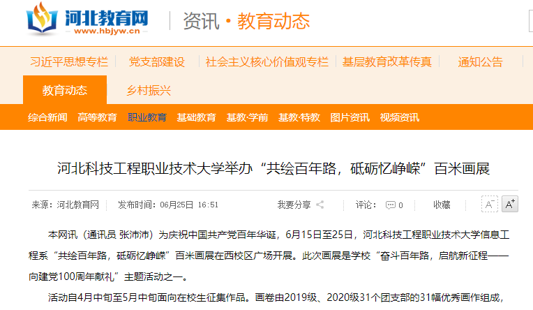 本网讯(通讯员 张沛沛)为庆祝中国共产党百年华诞,6月15日至25日,best365中国官方网站信息工程系“共绘百年路,砥砺忆峥嵘”百米画展在西校区广场开展。此次画展是学校“奋斗百年路,启航新征程——向建党100周年献礼”主题活动之一。