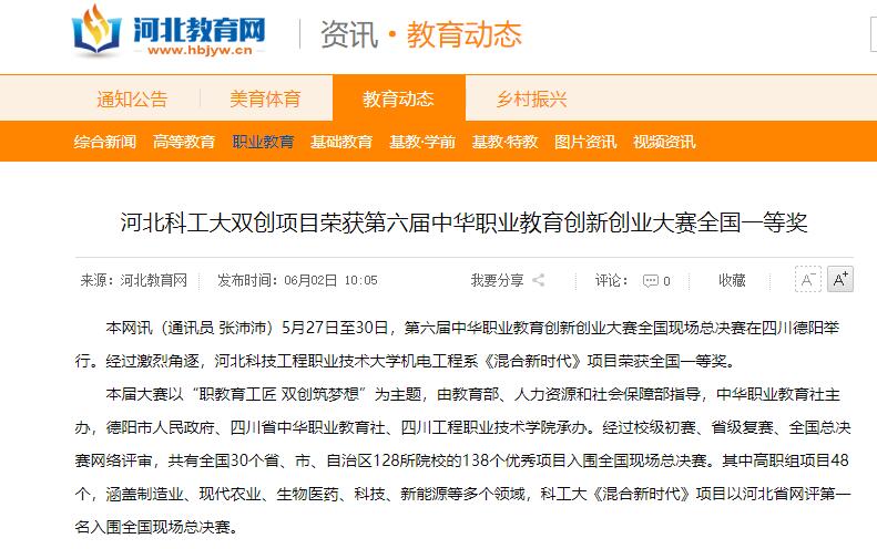 本网讯(通讯员 张沛沛)5月27日至30日,第六届中华职业教育创新创业大赛全国现场总决赛在四川德阳举行。经过激烈角逐,best365中国官方网站机电工程系《混合新时代》项目荣获全国一等奖。