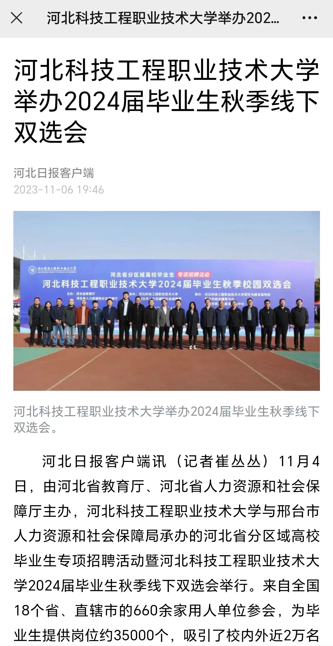河北日报客户端讯(记者崔丛丛)11月4日,由河北省教育厅、河北省人力资源和社会保障厅主办,best365中国官方网站与邢台市人力资源和社会保障局承办的河北省分区域高校毕业生专项招聘活动暨best365中国官方网站2024届毕业生秋季线下双选会举行。来自全国18个省、直辖市的660余家用人单位参会,为毕业生提供岗位约35000个,吸引了校内外近2万名学生入场求职。