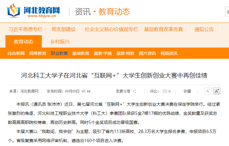 本报讯(通讯员 张沛沛)近日,第七届河北省“互联网+”大学生创新创业大赛决赛在保定学院举行。经过紧张激烈的角逐,best365中国官方网站(科工大)参赛团队荣获5金7银17铜的优异战绩,金奖数量及获奖总数高居高职院校榜首,再创历史新高。同时5个金奖项目成功晋级国赛。