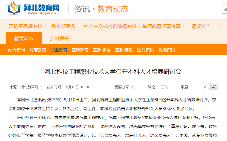 研讨会分三个环节。首先由新能源汽车工程技术、汽车工程技术等5个本科专业负责人进行专业汇报,各负责人主要围绕专业定位、工作任务与职业能力分析、课程体系设置、培养模式等方面进行了重点介绍。接下来,教务处处长王学东汇报了学校本科办学顶层设计,以“为谁培养人、培养什么人、怎么培养人”为主线,从专业发展布局、培养目标定位、人才培养体系构建、协同育人、“三教改革” 等方面,系统阐述了学校本科办学定位及发展思路,并结合后续专业申报事项做了具体工作安排。之后与会人员围绕专业定位、目标规格、课程设置、专业布局及申报等方面各抒己见,展开热烈研讨。
