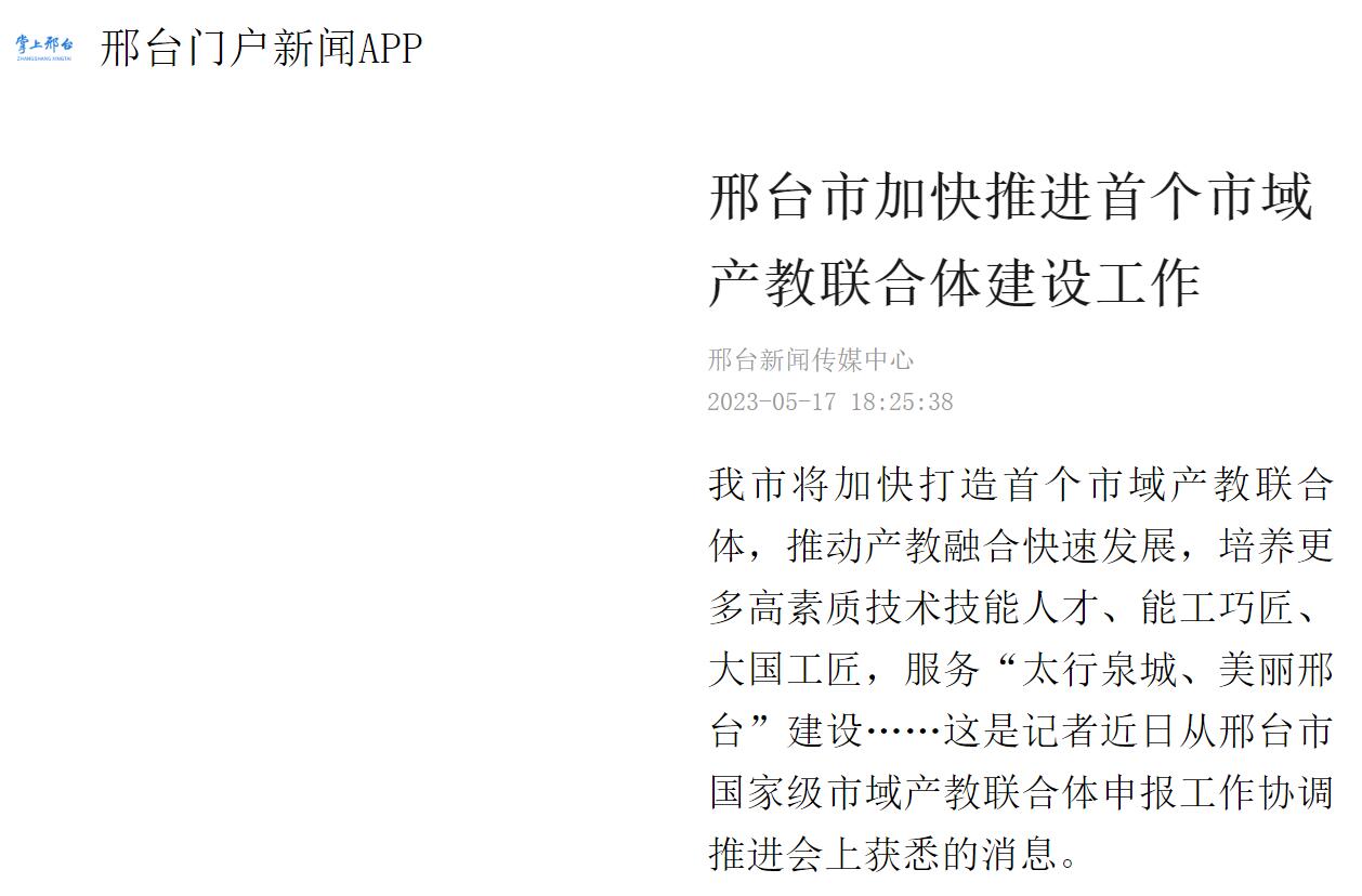 据悉,市域产教联合体将在创新型人才培养与输出、科技创新、创新创业等领域赋能邢台市产业企业转型升级,进一步深化我市职业教育改革,更好为我市经济社会发展汇才聚智,为建设“太行泉城、美丽邢台”贡献职教力量。(记者:刘晓燕 通讯员:张沛沛)