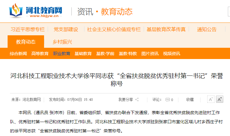 本网讯(通讯员 张沛沛)日前,省委组织部、省扶贫办联合下发通报,表彰全省优秀扶贫脱贫先进驻村工作队、优秀驻村第一书记和优秀驻村工作队员。best365中国官方网站派驻到张家口市宣化区塔儿村乡西庄子村的徐平同志获“全省扶贫脱贫优秀驻村第一书记”荣誉称号。