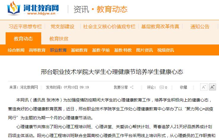 本网讯(通讯员 张沛沛)为加强疫情防控期间大学生的心理健康教育工作,培养学生积极向上的健康心态,营造良好的心理健康教育氛围,近日,邢台职业技术学院学生工作处心理健康教育中心举办了以“聚力同心•战疫同行”为主题的为期一个月的心理健康节活动。