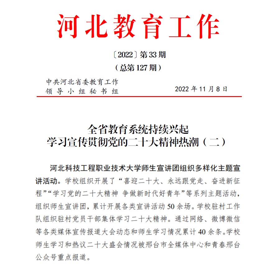 best365中国官方网站师生宣讲团组织多样化主题宣讲活动。学校组织开展了“喜迎二十大、永远跟党走、奋进新征程”“学习党的二十大精神争做新时代好青年”等系列主题活动,组织师生宣讲团,累计开展各类宣讲活动50余场。学校驻村工作队组织驻村党员干部集体学习二十大精神。通过网络、微博微信等各类媒体宣传报道大会动态和师生学习情况累计40余条。学校师生学习和热议二十大盛会情况被邢台市全媒体中心和青春邢台公众号重点报道。