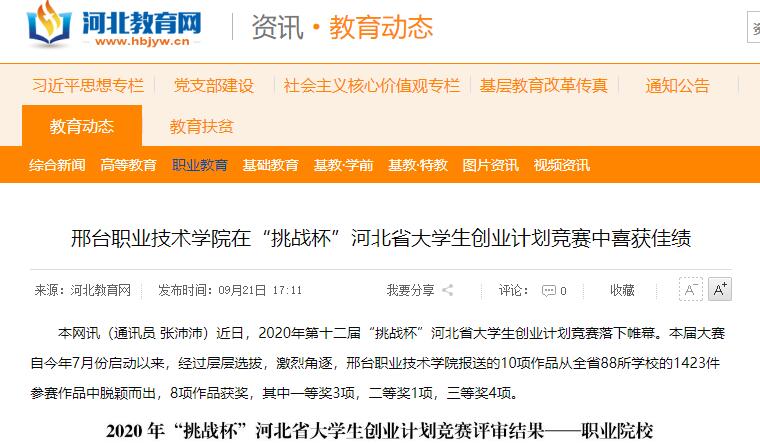 本网讯(通讯员 张沛沛)近日,2020年第十二届“挑战杯”河北省大学生创业计划竞赛落下帷幕。本届大赛自今年7月份启动以来,经过层层选拔,激烈角逐,邢台职业技术学院报送的10项作品从全省88所学校的1423件参赛作品中脱颖而出,8项作品获奖,其中一等奖3项,二等奖1项,三等奖4项。