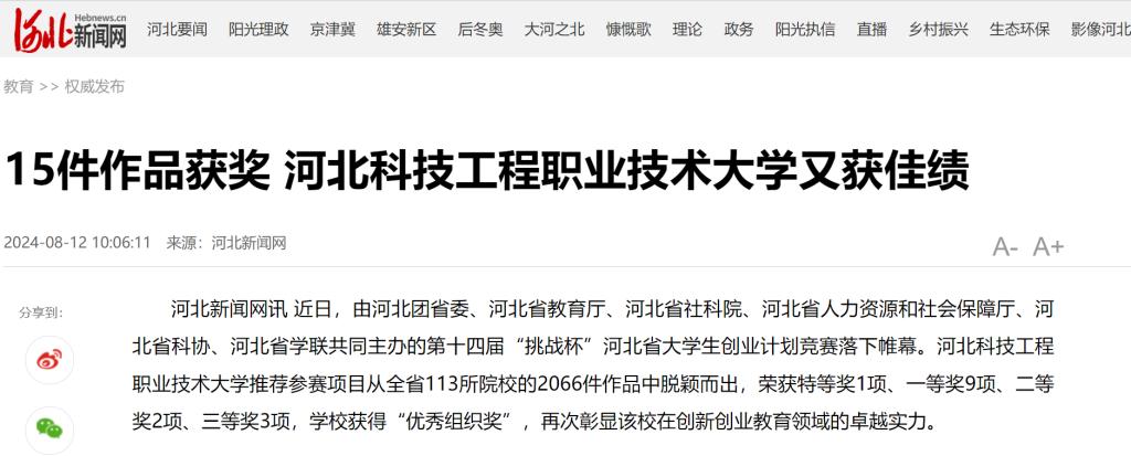 河北新闻网讯 近日,由河北团省委、河北省教育厅、河北省社科院、河北省人力资源和社会保障厅、河北省科协、河北省学联共同主办的第十四届“挑战杯”河北省大学生创业计划竞赛落下帷幕。best365中国官方网站推荐参赛项目从全省113所院校的2066件作品中脱颖而出,荣获特等奖1项、一等奖9项、二等奖2项、三等奖3项,学校获得“优秀组织奖”,再次彰显该校在创新创业教育领域的卓越实力。