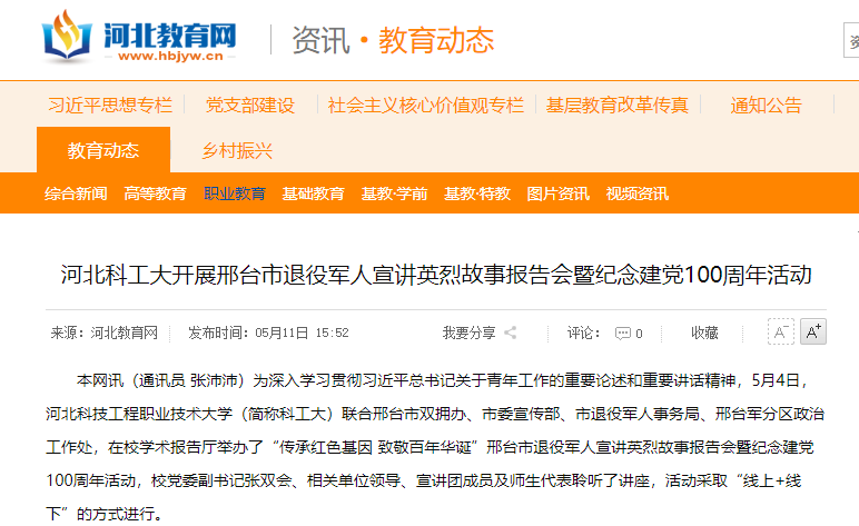 本网讯(通讯员 张沛沛)为深入学习贯彻习近平总书记关于青年工作的重要论述和重要讲话精神,5月4日,best365中国官方网站(简称科工大)联合邢台市双拥办、市委宣传部、市退役军人事务局、邢台军分区政治工作处,在校学术报告厅举办了“传承红色基因 致敬百年华诞”邢台市退役军人宣讲英烈故事报告会暨庆祝建党100周年活动,校党委副书记张双会、相关单位领导、宣讲团成员及师生代表聆听了讲座,活动采取“线上+线下”的方式进行。