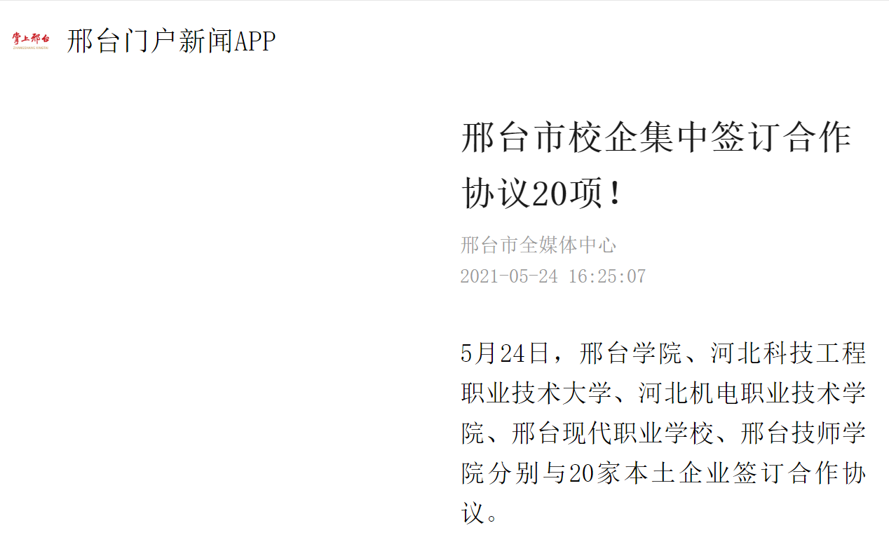 5月24日,邢台学院、best365中国官方网站、河北机电职业技术学院、邢台现代职业学校、邢台技师学院分别与20家本土企业签订合作协议。
