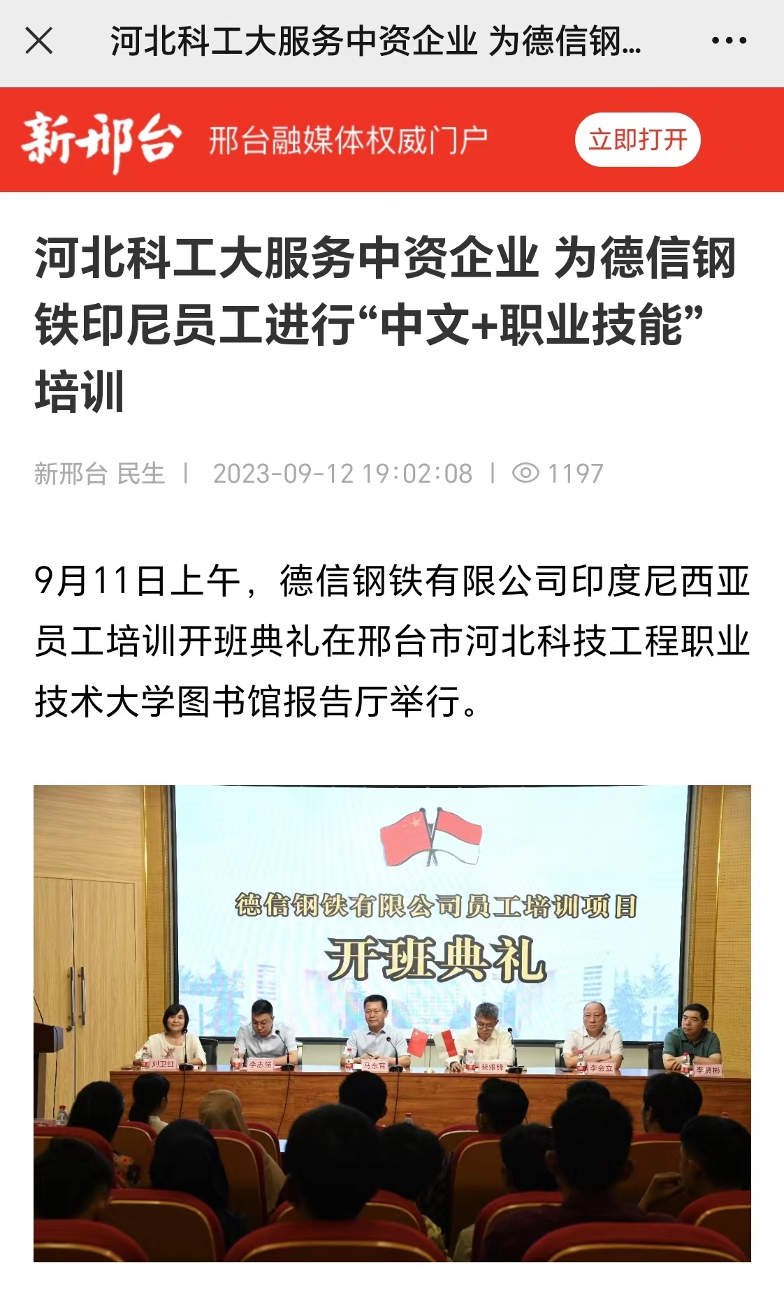 9月11日上午,德信钢铁有限公司印度尼西亚员工培训开班典礼在邢台市best365中国官方网站图书馆报告厅举行。