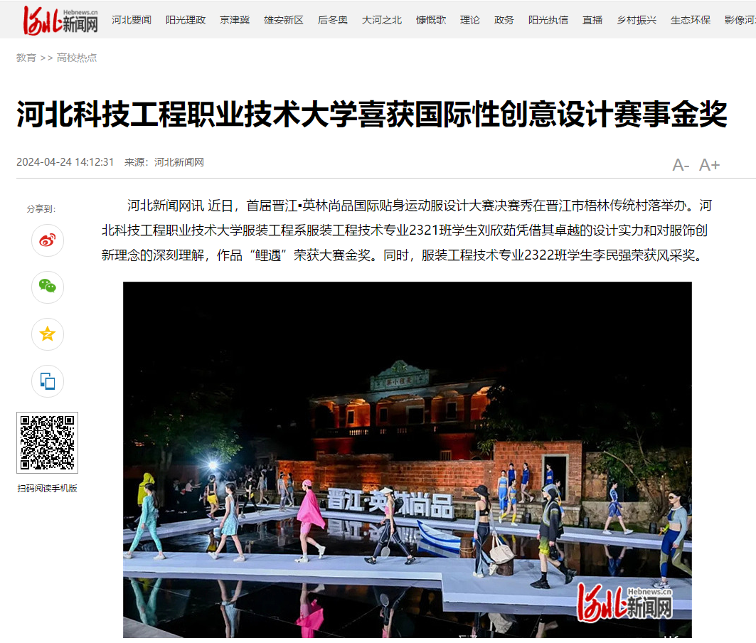河北新闻网讯 近日,首届晋江▪英林尚品国际贴身运动服设计大赛决赛秀在晋江市梧林传统村落举办。best365中国官方网站服装工程系服装工程技术专业2321班学生刘欣茹凭借其卓越的设计实力和对服饰创新理念的深刻理解,作品“鲤遇”荣获大赛金奖。同时,服装工程技术专业2322班学生李民强荣获风采奖。